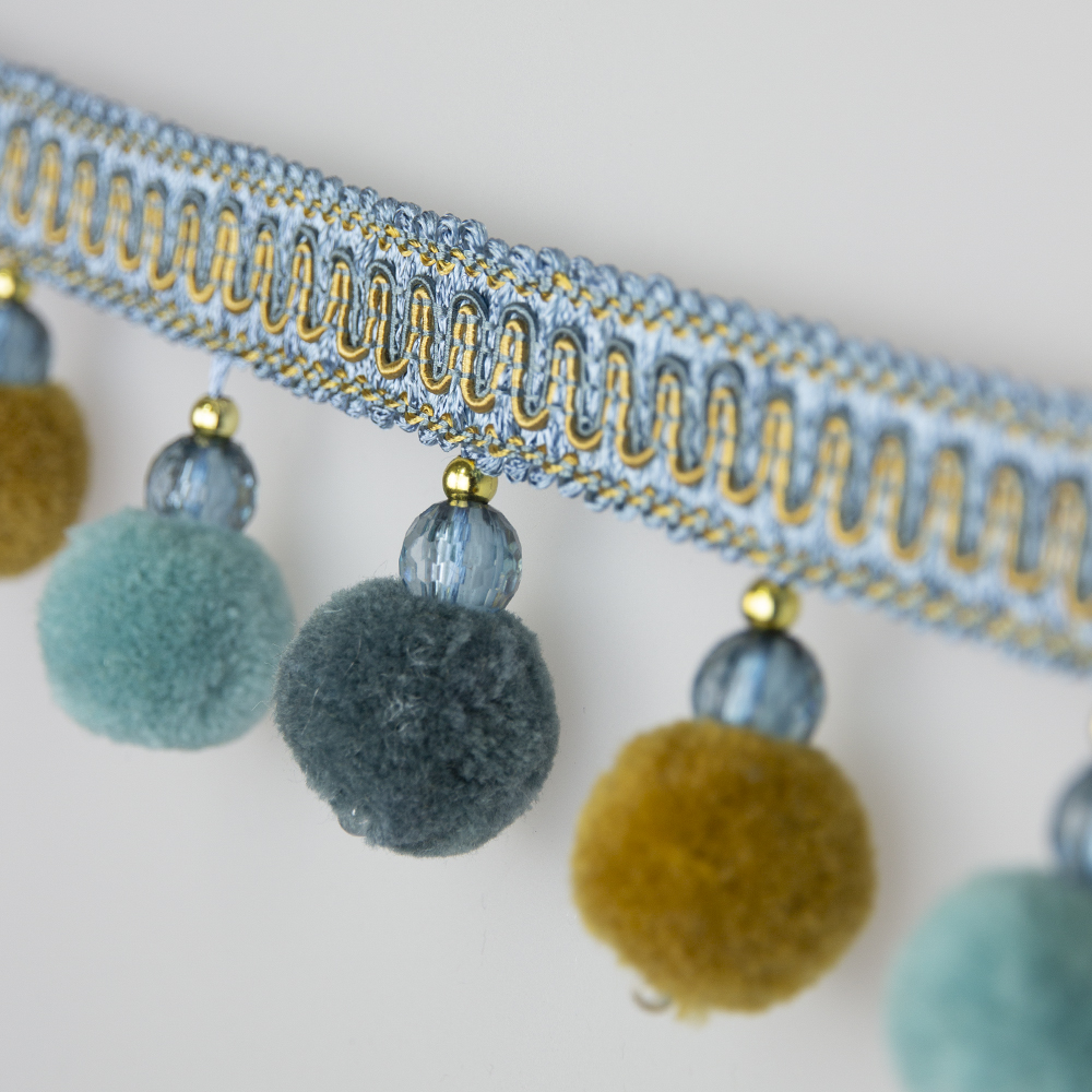 Бахрома используется как декоративный элемент, который украсит любую штору, декоративные подушки, покрывало, подхваты для штор. Так же можно добавить бахрому как декор на жесткие и мягкие ламбрекены.У нас в наличии Бахрома "Бубенчики-пушистики" YM2019-4 Mirtex бирюзовый/бежевый/св.-бирюзовый (6 см/D2,5 см/11,5 м), артикул 00068581 в отличном качестве.