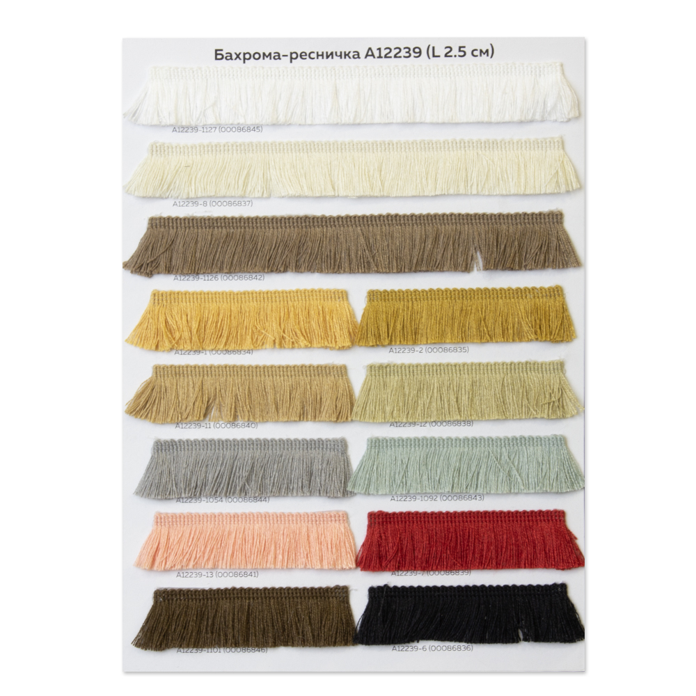 Каталог-карта бахромы – это удобный и практичный набор образцов бахромы различных видов, цветов и текстур. Идеальный инструмент для дизайнеров, декораторов и рукодельниц, которые хотят быстро подобрать подходящий вариант для своих проектов. Каталог позволяет оценить качество и внешний вид бахромы перед покупкой.