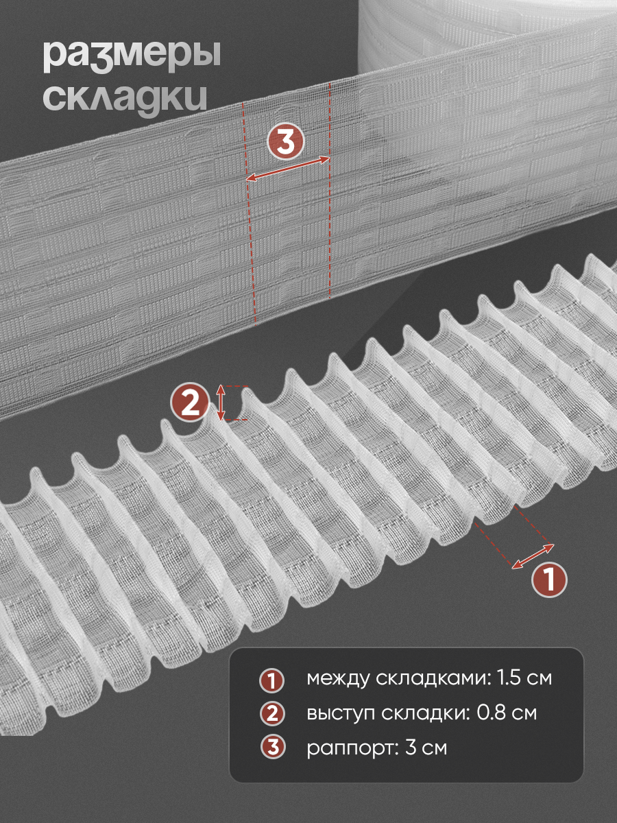 Особенности: широка 8.5 см, фиксированные складки, популярный коэффициент 1:2, многокарманная - возможность регулировать высоту у готового изделия. Близкое расположение петель по высоте, что позволяет захватить крючком сразу 2 петли, для лучшей фиксации крючка и статичности шторы, лесочные петли можно разделять и например, использовать 1.5 шт. Маленький выступ складки 0.7 см, только для тонких тканей.