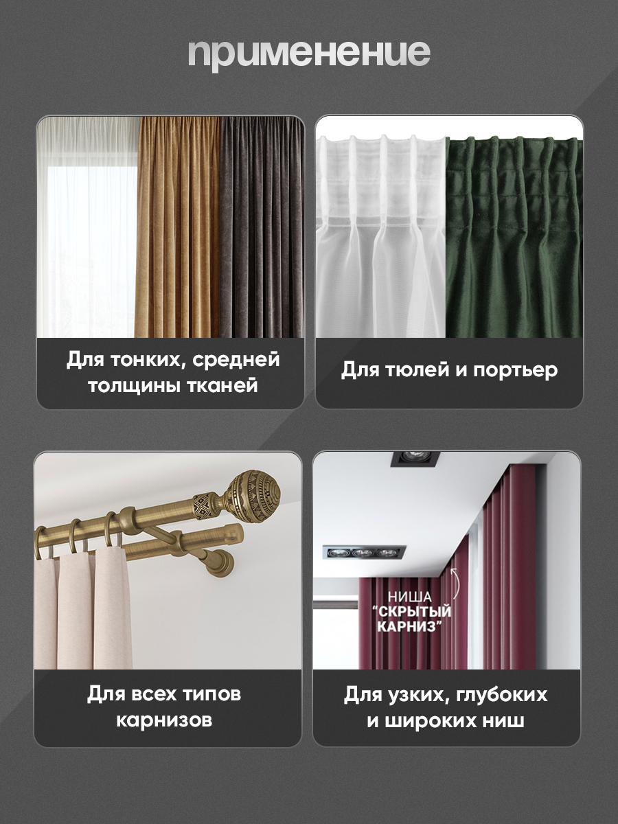 Рекомендации в применение: для штор высотой до 3.5 м, широких, узких иглубоких ниш, для всех типов карнизов.