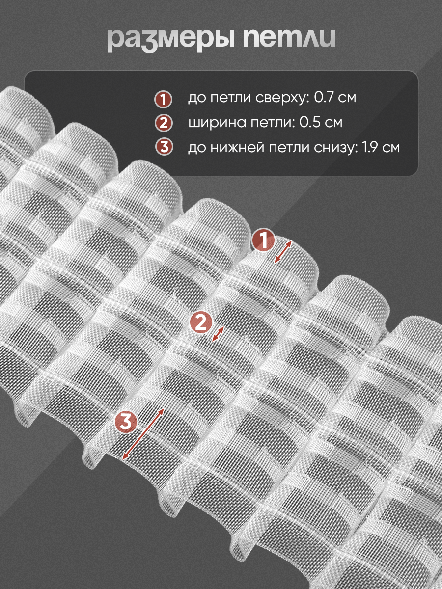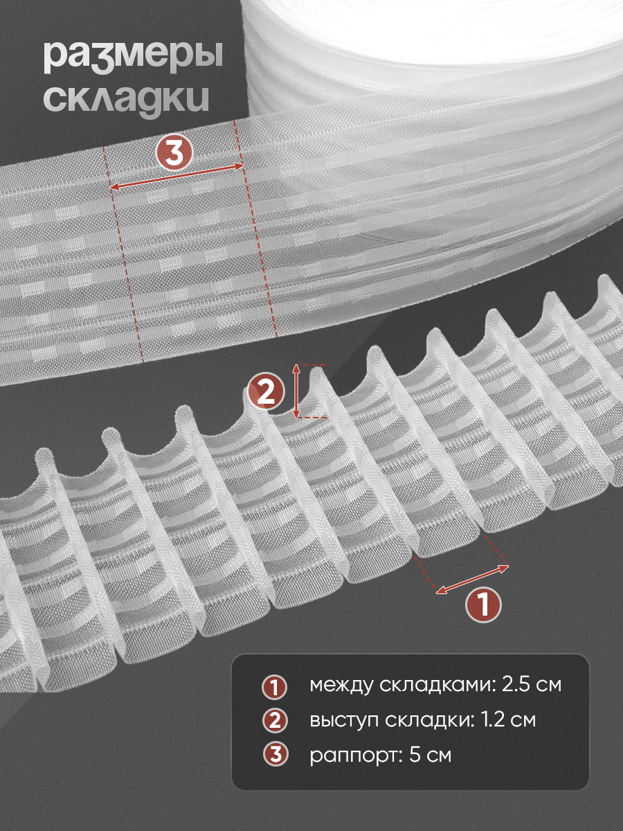 Особенности: ширина 8.3 см, фиксированные складки, популярный коэффициент, многокарманная - возможность регулировать высоту у готового изделия. Близкое расположение петель по высоте, что позволяет захватить крючком сразу 2 петли, для лучшей фиксации крючка и статичности шторы. Узкие петли, крепко зафиксируют крючок.