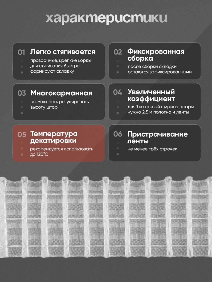 Особенности: широкая 8 см, фиксированные складки, с экономным коэффициент 1:2.5, многокарманная - возможность регулировать высоту у готового изделия. Большой выступ складки 1.8 см, сформирует красивую драпировку у шторы. Принадлежит к серии лент с разными коэффициентами, прозрачные, тканые: 1:1.5, 1:2, 1:2.5.