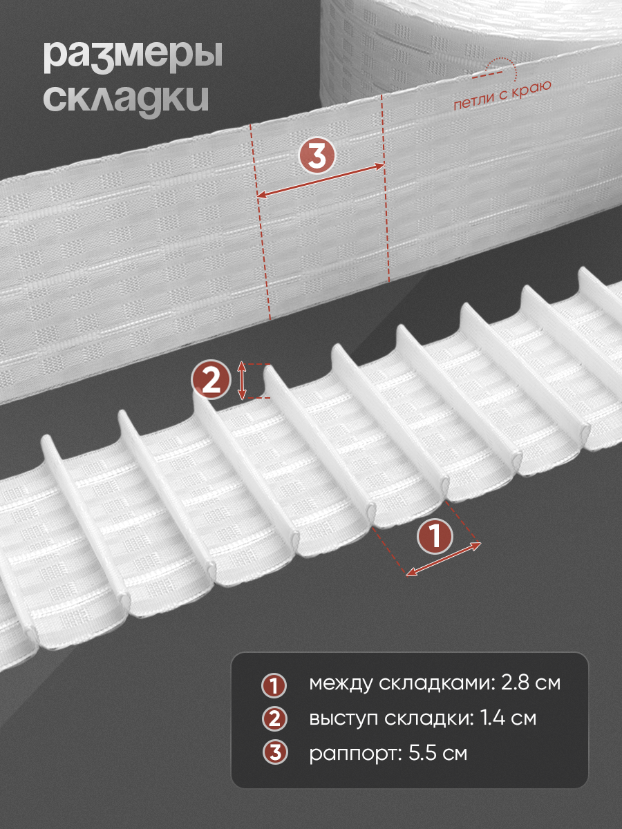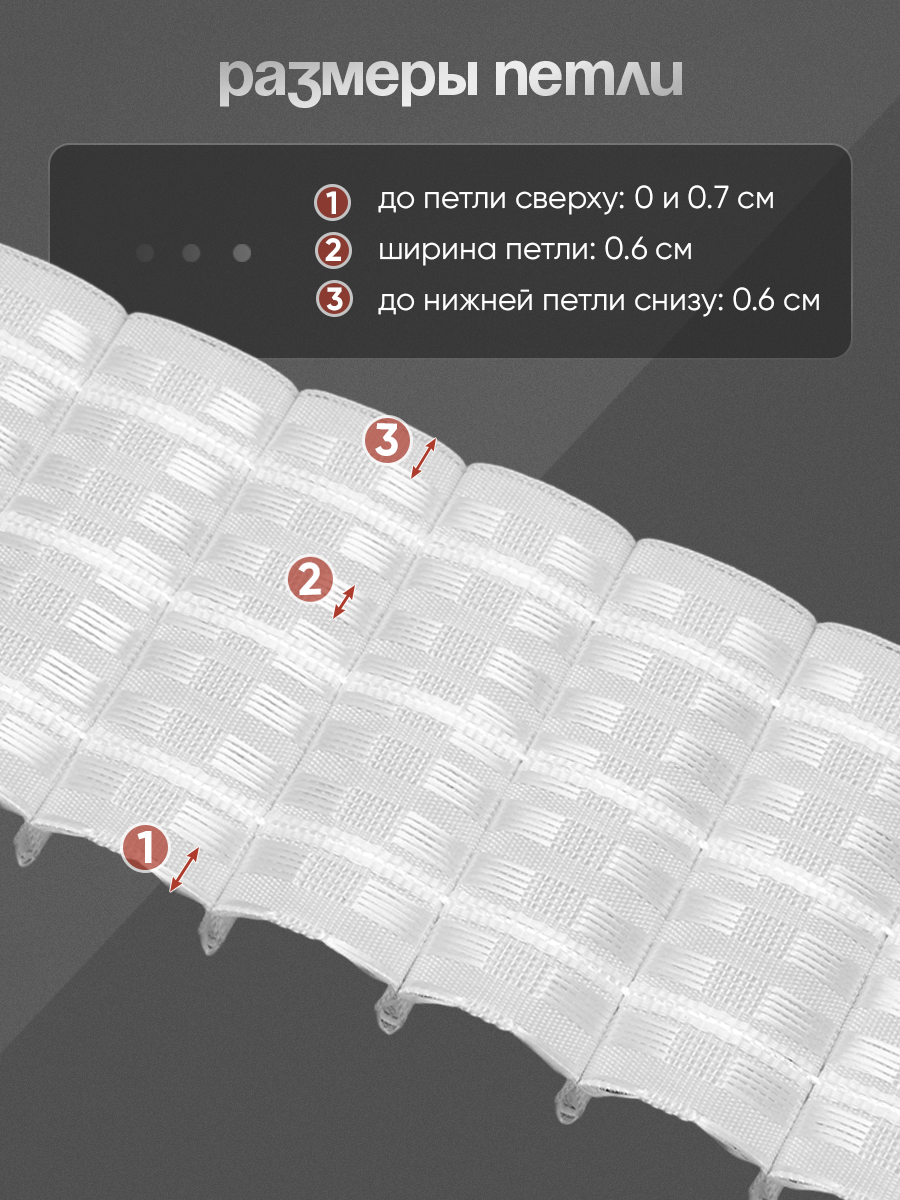 Особенности: средней ширины 8 см, фиксированные складки, популярный коэффициент, многокарманная - возможность регулировать высоту у готового изделия. Близкое расположение петель по высоте, что позволяет захватить крючком сразу 2 петли, для лучшей фиксации крючка и статичности шторы. За счет ниточной структуры петель, можно регулировать высоту штор на 1.5 шт петли. Средний выступ складки 1.4 см, сформирует красивую драпировку у шторы из тонких и средней толщины тканей. Есть петли внутри складки, одевая туда крючок, уменьшается выступ складки у ленты вперед. Также можно использовать петлю по краю ленты, чтобы максимально опустить шторы (желательно этот прием использовать в нише, чтобы перекрыть просвет между шторой и карнизом). Рекомендуем одевать крючок сразу за две петли располагающиеся по краям складки или использовать двойной крючок "Улитка". Есть прозрачный компаньон.
