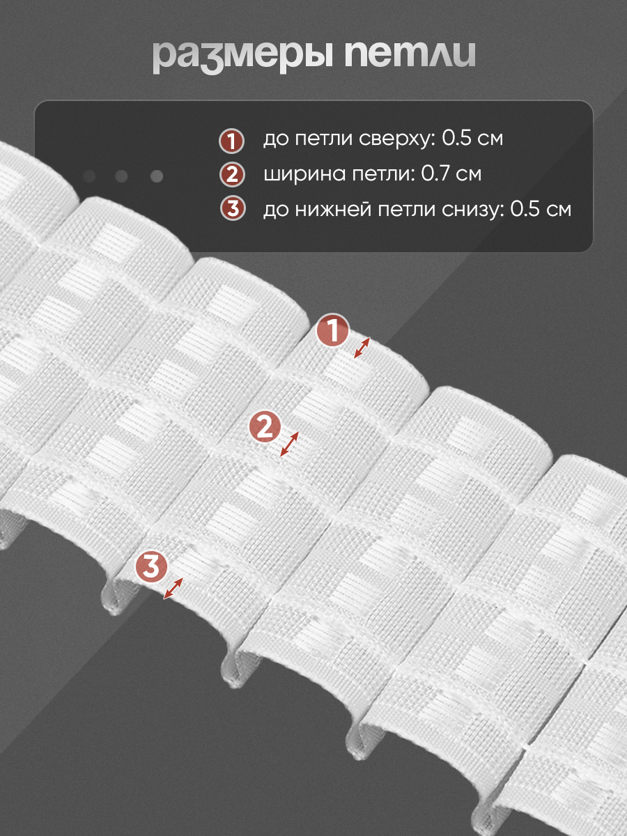 Особенности: средней ширины 6.5 см, фиксированные складки, популярный коэффициент, многокарманная - возможность регулировать высоту у готового изделия. Близкое расположение петель по высоте, что позволяет захватить крючком сразу 2 петли, для лучшей фиксации крючка и статичности шторы, ниточные петли можно разделять и например, использовать 1.5 шт. Большой выступ складки 1.6 см, сформирует красивую драпировку у шторы. Есть прозрачный компаньон.
