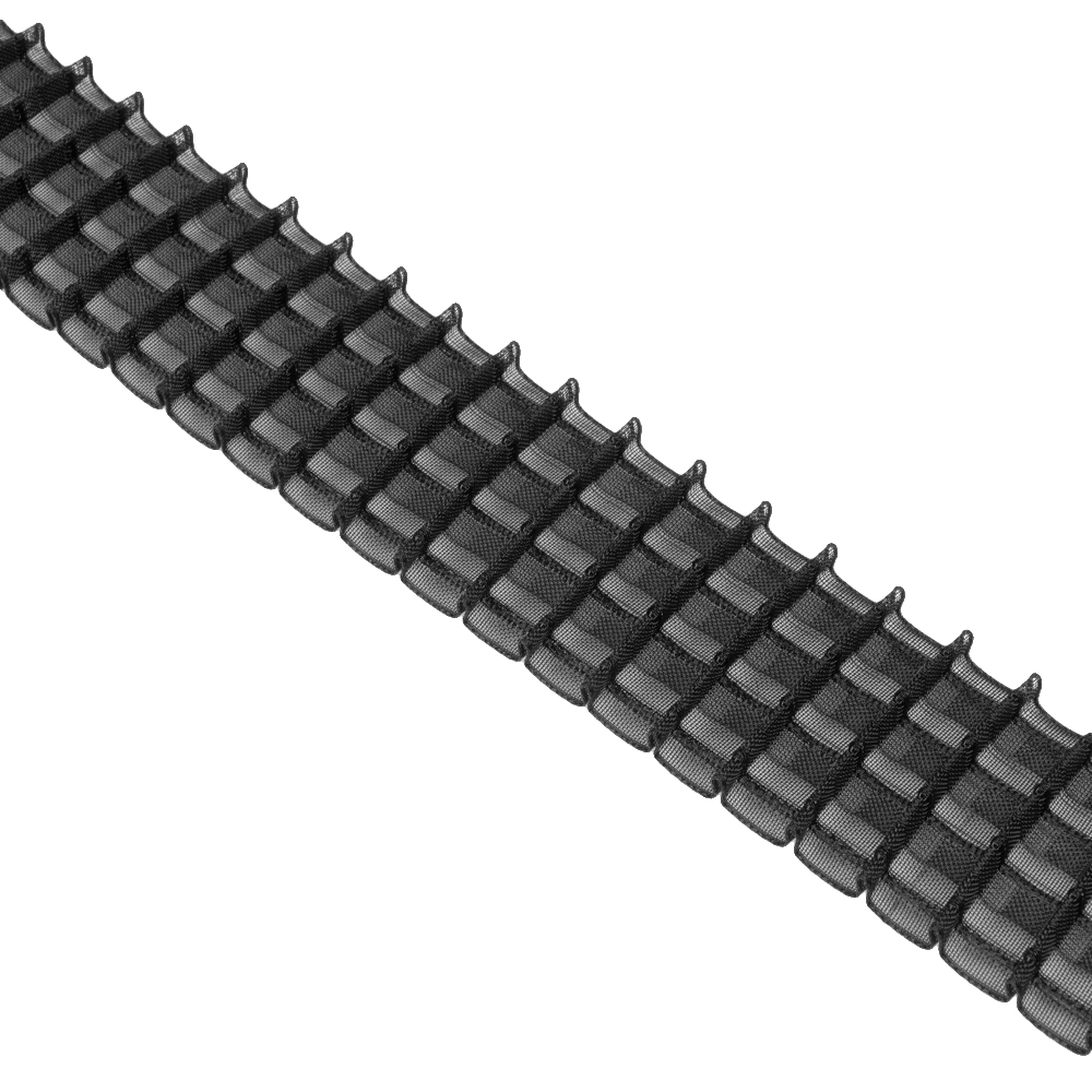 Особенности: средняя ширина 6.5 см, фиксированные складки, популярный коэффициент, маленькое расстояние от верхней петли до края ленты, многокарманная. Маленький выступ складки, подойдет только для легких тканей. Узкие петли 0.7 см, крепко зафиксируют крючок. Принадлежит к серии лент с разными коэффициентами, прозрачные, тканые, черные: 1:1.3, 1:1.5, 1:1.8, 1:2, 1:2.5, 1:3.