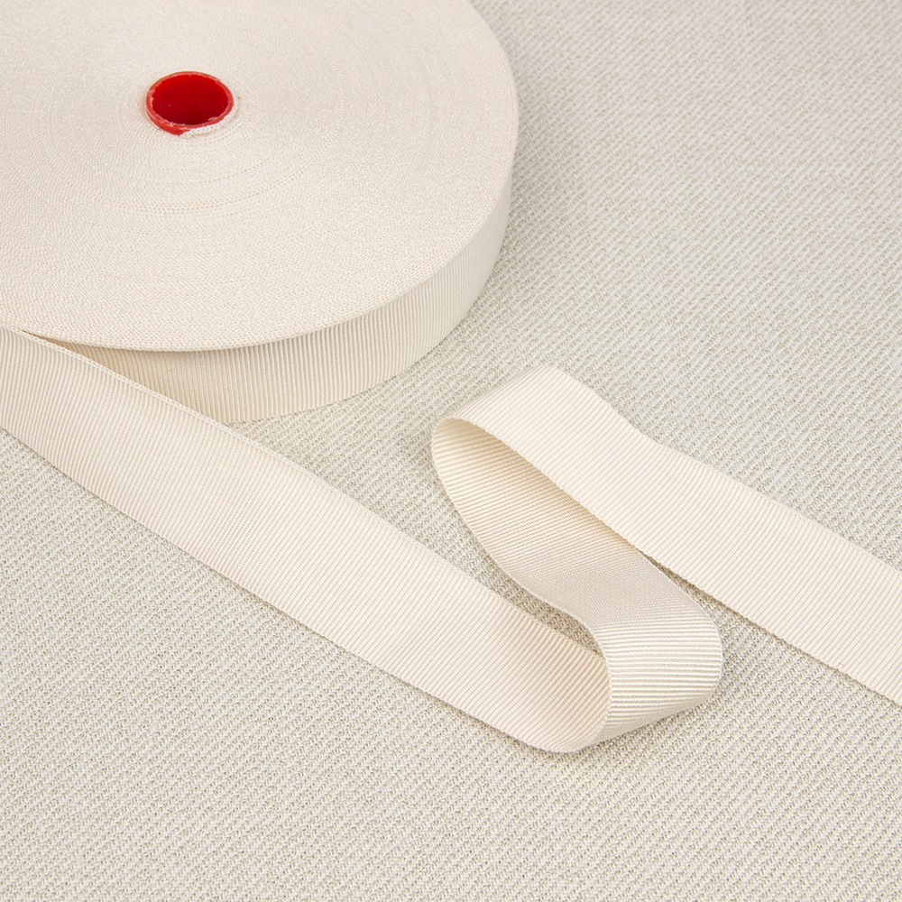 Лента репсовая представляет собой полоску плотной ткани с мелким на поверхности, явно выраженным поперечным рубчиком, продольные края ленты закреплены тонкой кромкой.