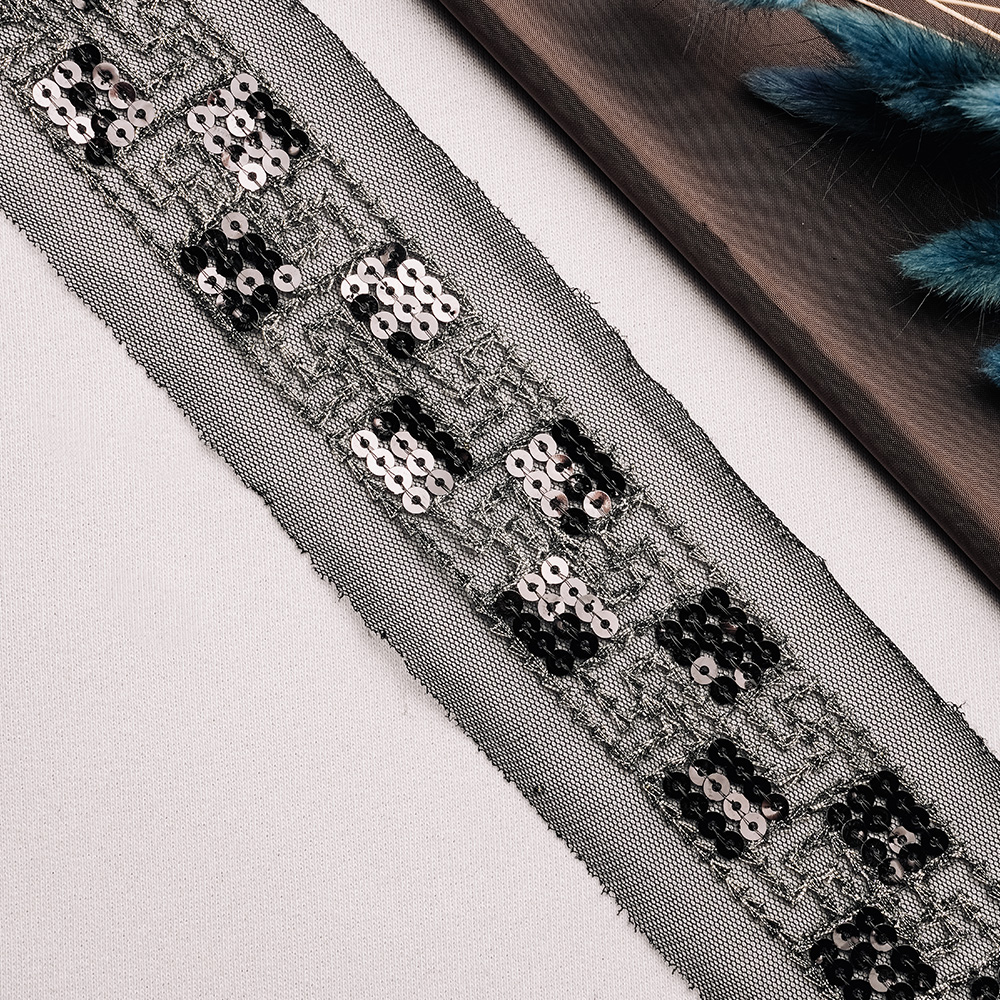 Тесьма с пайетками B061-12 черный/серебро (15 ярд)
