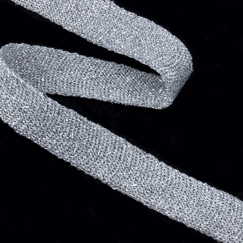 Неэластичная трикотажная тесьма предназначена для декорирования одежды, головных уборов, дизайнерских работ. По структуре напоминает репсовую ленту, но значительно мягче. Имеет декоративные металлизированные вставки по всей длине.