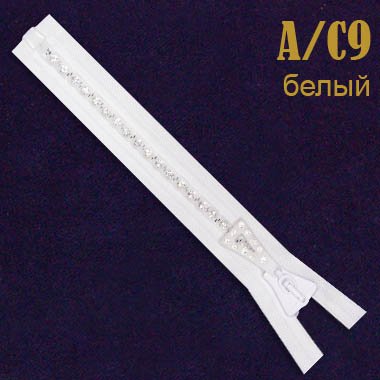 Молния со стразами - это устройство, состоящее из двух текстильных лент, на которых закреплены пластиковые звенья со стразами кристал, соединяемые при движении слайдера, украшенным стразами кристал. Применение: юбки, платья, брюки, костюмы, пальто, куртки, ветровки, подушки декоративные.У нас в наличии Молния со стразами разъемная 35-А/С9 белая, артикул 00024376 в отличном качестве.
